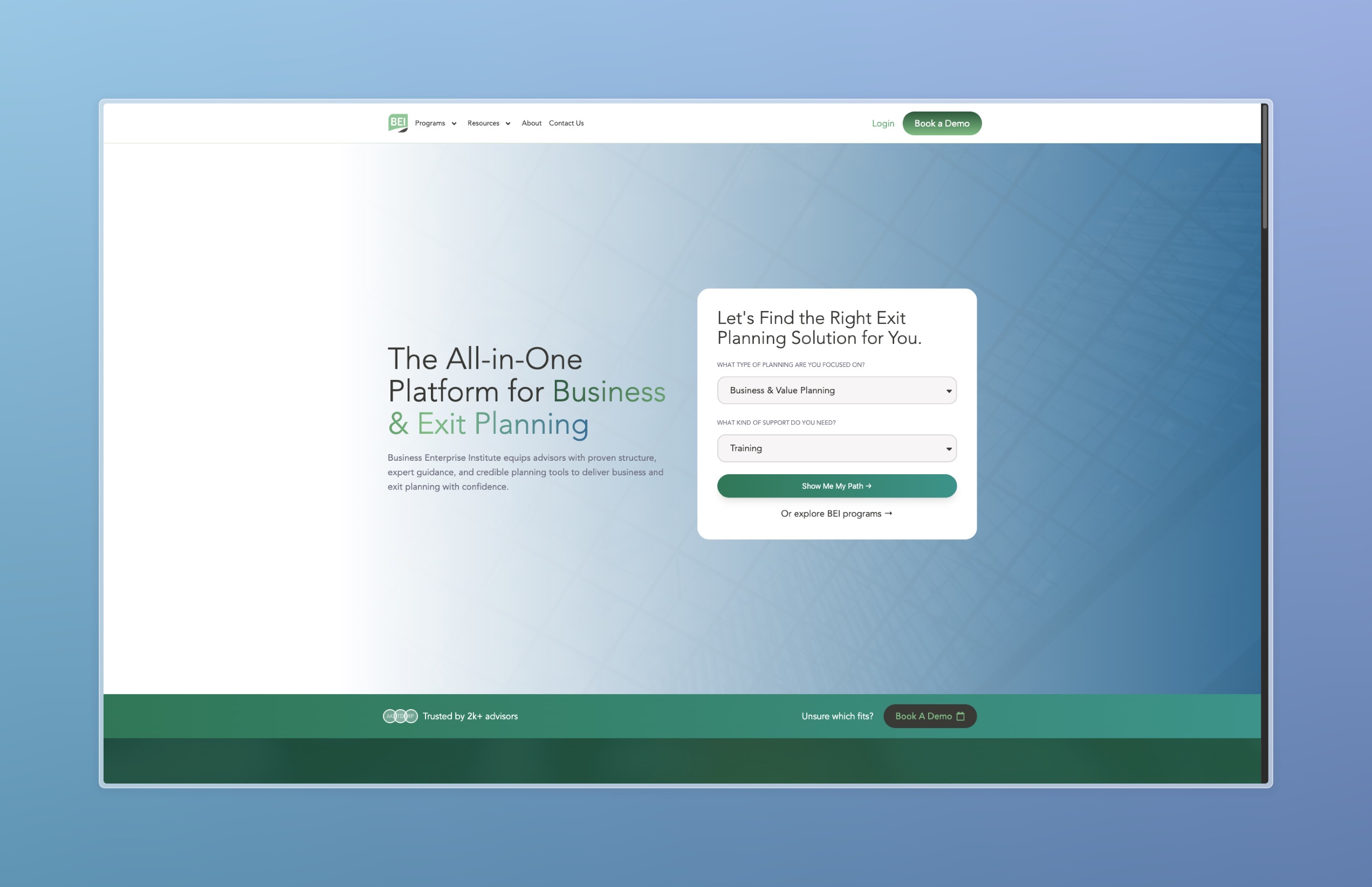 A full website redesign for BEI, creating a modern, conversion-oriented platform that clearly communicates their value to professional advisors — attorneys, CPAs, consultants, and financial professionals guiding business owners through exit planning. Focused on lead generation, messaging clarity, and scalable architecture.